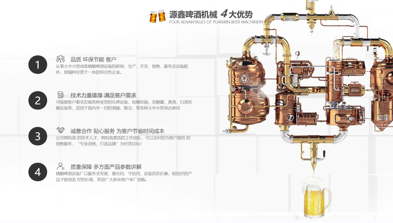 南陽(yáng)市源鑫啤酒機(jī)械設(shè)備有限公司位于歷史文化名城一-南陽(yáng),從事大中小型成套啤酒、白酒自釀設(shè)備的研制、生產(chǎn)、開(kāi)發(fā)、銷售、服務(wù)及設(shè)備配件、原輔料經(jīng)營(yíng)于一體的綜合性企業(yè)。公司可根據(jù)客戶要求定做各種類型的扎啤設(shè)備,如糖化鍋,發(fā)酵罐,黃酒、白酒發(fā)酵設(shè)備等,適用于國(guó)內(nèi)外一切的酒樓、餐廳、家庭.聚會(huì)、酒吧等各種大、中、小型場(chǎng)合使用。公司擁有技術(shù)人才,擁有高素質(zhì)的工作團(tuán)隊(duì),可以及時(shí)的為客戶提供**的銷售服務(wù)。公司以“專業(yè)資格,打造品牌”為經(jīng)營(yíng)目標(biāo),“卓越質(zhì)量,信賴價(jià)格”為經(jīng)營(yíng)宗旨,以質(zhì)量求生存,以服務(wù)求發(fā)展,重合同、守信用,設(shè)備質(zhì)優(yōu)價(jià)廉。相信好的產(chǎn)品才能創(chuàng)造 好的價(jià)值,歡迎廣大新老客戶來(lái)廠選購(gòu)。...